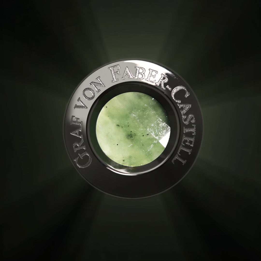- Une pierre de jade verte facettée orne l’embout du capuchon