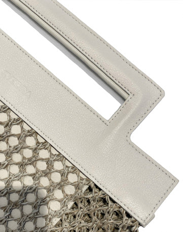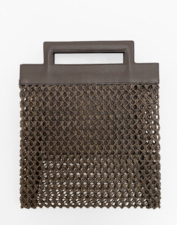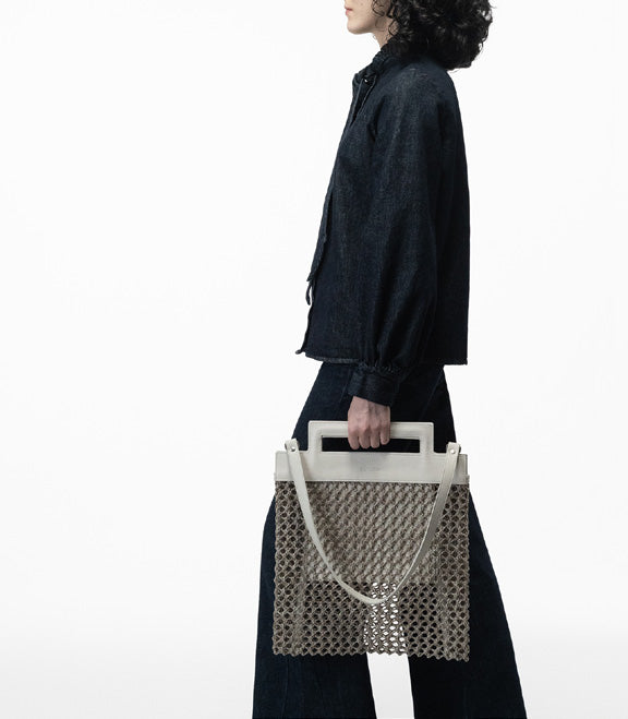 Defined by the contrast between leather and an open, crochet-like textile, Cesca combines structure with lightness. Its semi-transparent construction allows a glimpse of the interior, complemented by a large leather pocket for essentials. Designed to be carried by hand with its integrated handle or over the shoulder with a detachable strap, the bag maintains a minimal and architectural presence.